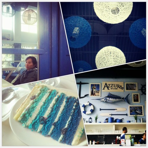 Azzura ini menyenangkan interiornya, warna birunya itu lho. Tapi sofanya sekarang udah pada dekil. Sepertinya tidak dicuci untuk waktu yang sangat….lama. Kebayang sudah berapa pengunjung yang datang dan naikin kaki untuk nongkrong-nongkrong disitu. Sayang banget. Buku menunya juga kertasnya udah pada keriting. Tapi buat saya ini menunjukkan kalau kafe ini laku. Hehehe, banyak orang yang membuka-buka buku menu dengan brutal rupanya. Kalau makanan sih, standar. Standar enak maksudnya. Dengan harga standar pula. Standar cukup mahal. Namanya juga kafe di PVJ.