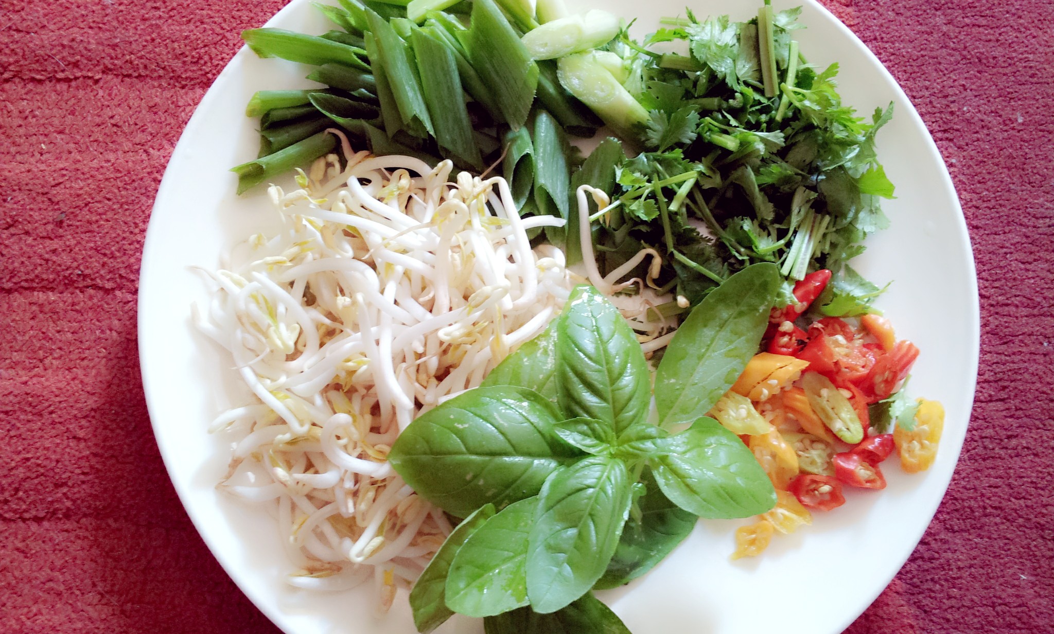 3-5 pucuk daun basil, atau siam queen basil, atau bila tidak juga punya daun basil, pakai saja daun kemangi. Namun wanginya akan lain tentu saja.