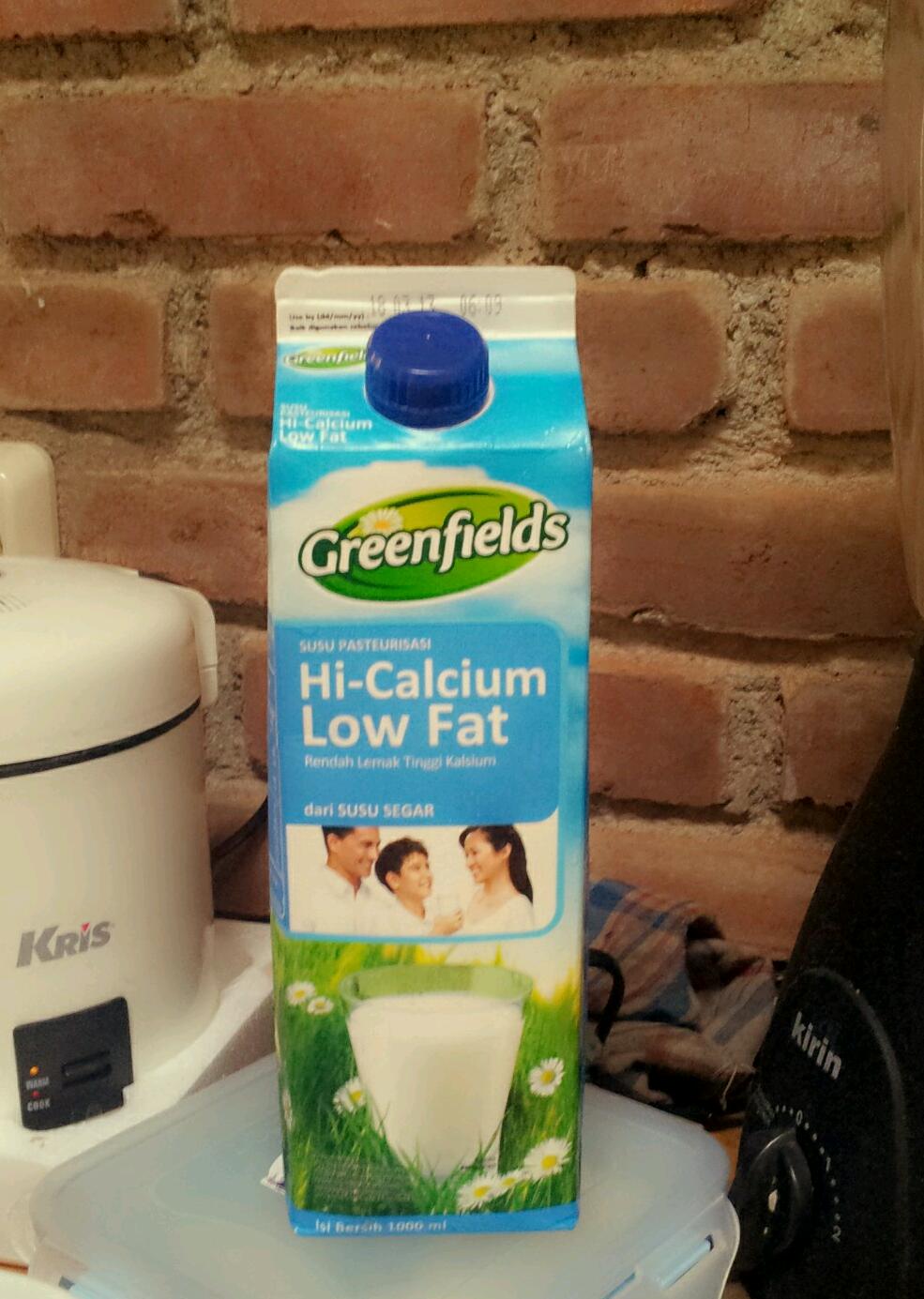 1 Karton Fresh Milk Greenfields, ukuran 1 liter. Ini tidak semua terpakai, tapi kan memasak sambil minum kopi panas dengan tambahan susu ini nikmat sekali lho! Coba saja.
