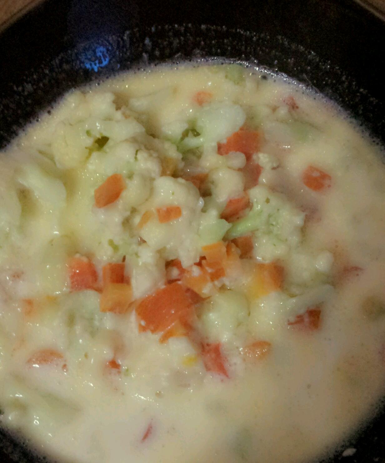 Namun ada satu resep nih yang paling disukai kami sekeluarga, Cauliflower Carrot Cheese and Milk Soup ala Chef Mira! Sebenarnya sih kalau bahasa Indonesianya, cukup bilang Sup Kembang Kol Wortel. Tapi anak-anak suka penamaan yang bombastis dan heboh,mungkin kalau mendengar ibunya heboh, akan menambah selera mereka untuk makan sepertinya.