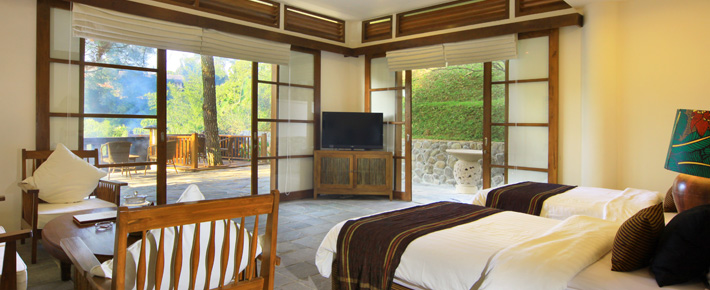 Kamar kami di lantai dua dan menghadap ke lembah yang hijau dan pohon yang rapat. Di pintu keluar ada tulisan untuk berhati-hati dengan monyet, karena kadang ada yang mampir nongol ke kamar kita. Apalagi kalau wajah kita mirip, siap-siap aja ditengok mereka.