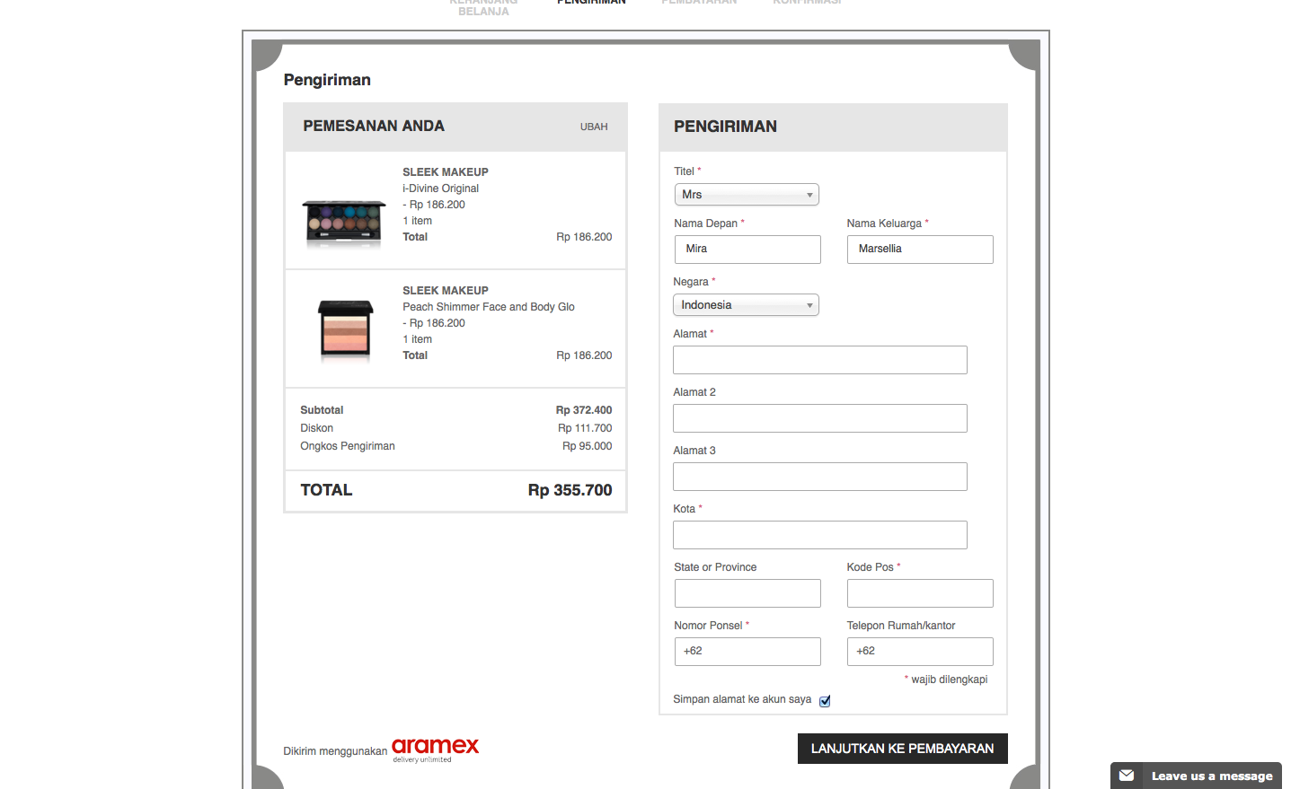 Setelah memilih produk yang disukai dan dimasukkan ke dalam keranjang (saya memilih Sleek i-Divine Original Palette dan Sleek Glo Face & Body Highlighter) kita akan masuk ke dalam proses selanjutnya sebagai berikut: