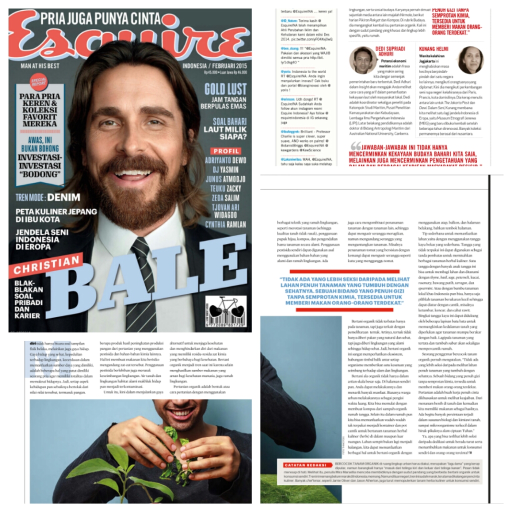 Pas lagi bulan Februari 2015 ini ada tulisan saya di rubrik budaya yang membahas tentang urban farming. Hehe tambah suka sama majalah Esquire. Versi onlinenya saya beli di getscoop. Harganya lebih murah dari versi cetak.