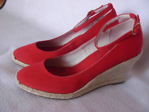 Saya selalu punya perasaan khusus pada sepatu dengan detail: wedges, espadrilles, platform… dan sepatu merah Nine West dengan detail barusan sungguh membuat saya cinta, ini dia: