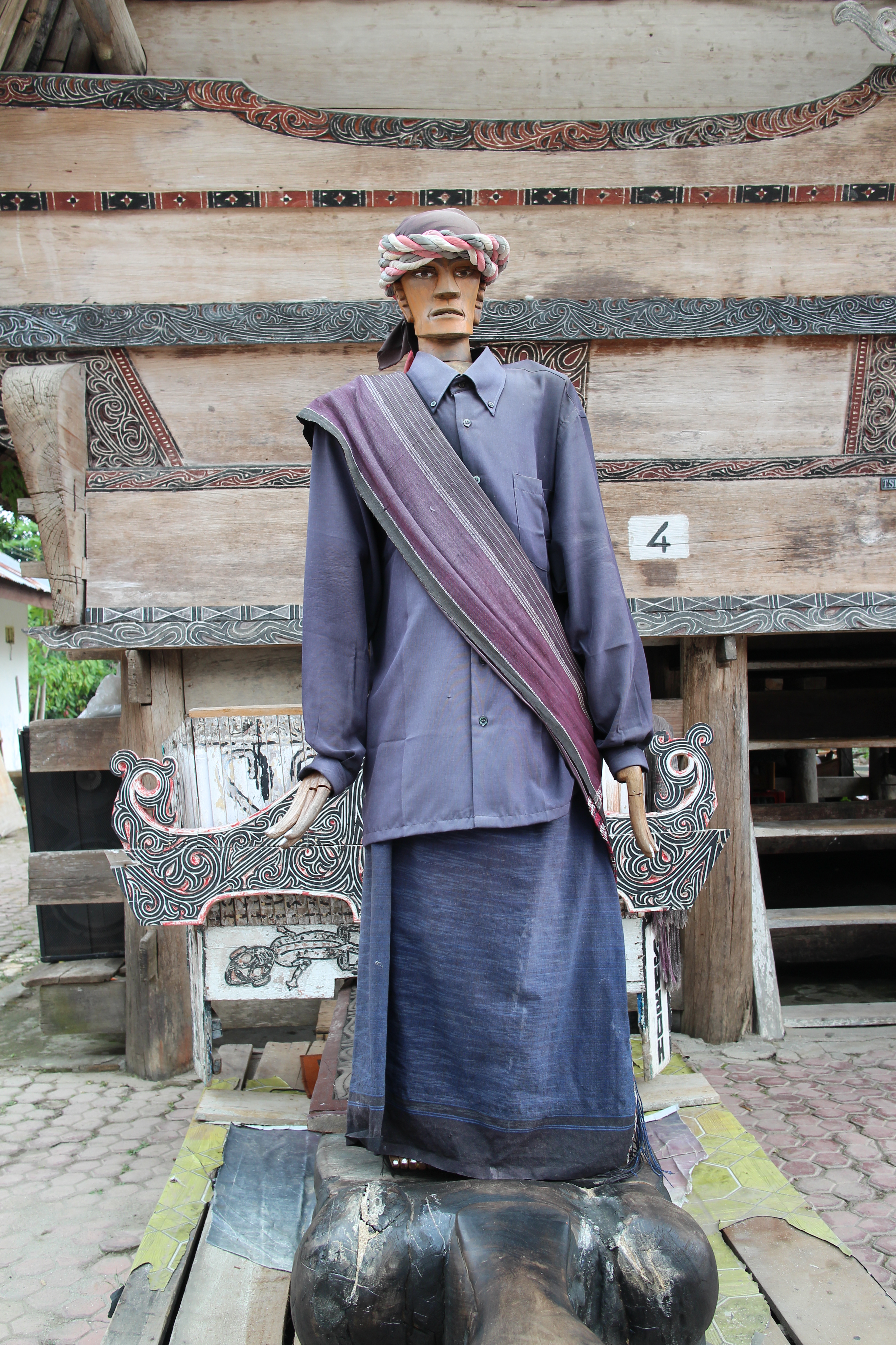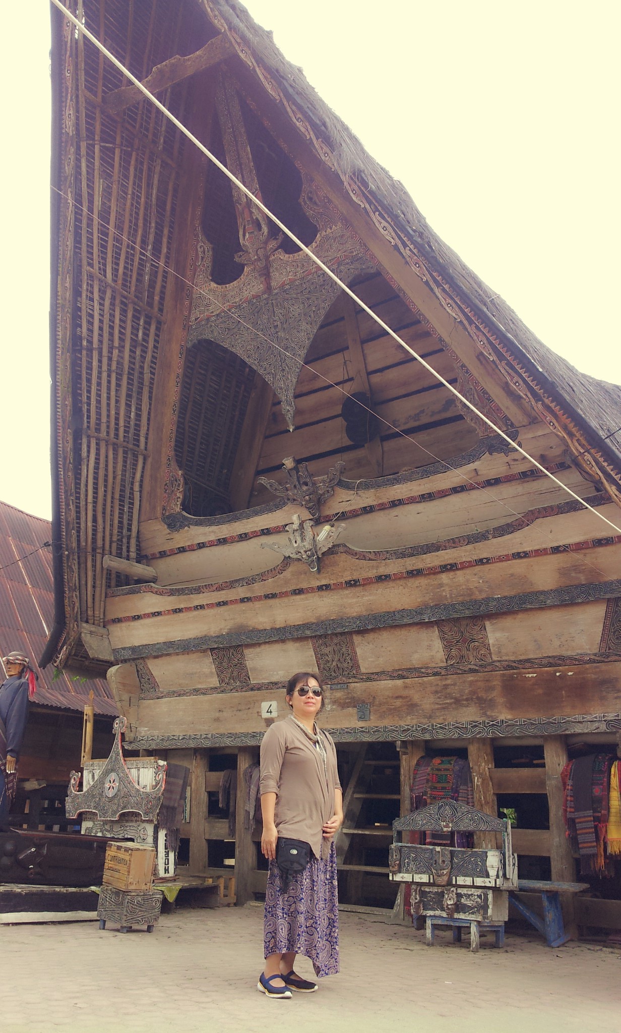 Dari komplek makam, kami beranjak ke komplek rumah adat Batak, rumah adat batak disebut Rumah Bolon. Rumahnya dari kayu yang arsitekturnya cantik sekali. Tampak ada ulos tersampir di dekat tangga kayu. Warnanya sungguh menarik hati. Di depan rumah-rumah adat Batak ini terdapat Patung Kayu Sigale-gale. Konon menurut hikayat, Raja Harahap yang sangat sedih kehilangan putra kesayangannya bernama Manggale dalam peperangan. Ia lalu memerintahkan pembuatan patung yang diberi pakaian dan menyerupai putranya, patung itu disebut Sigale-gale. Patung ini bisa bergerak dan menari secara mistis setelah dilakukan upacara tertentu, namun saat ini patung ini digerakan dengan tali sebagaimana marionette.